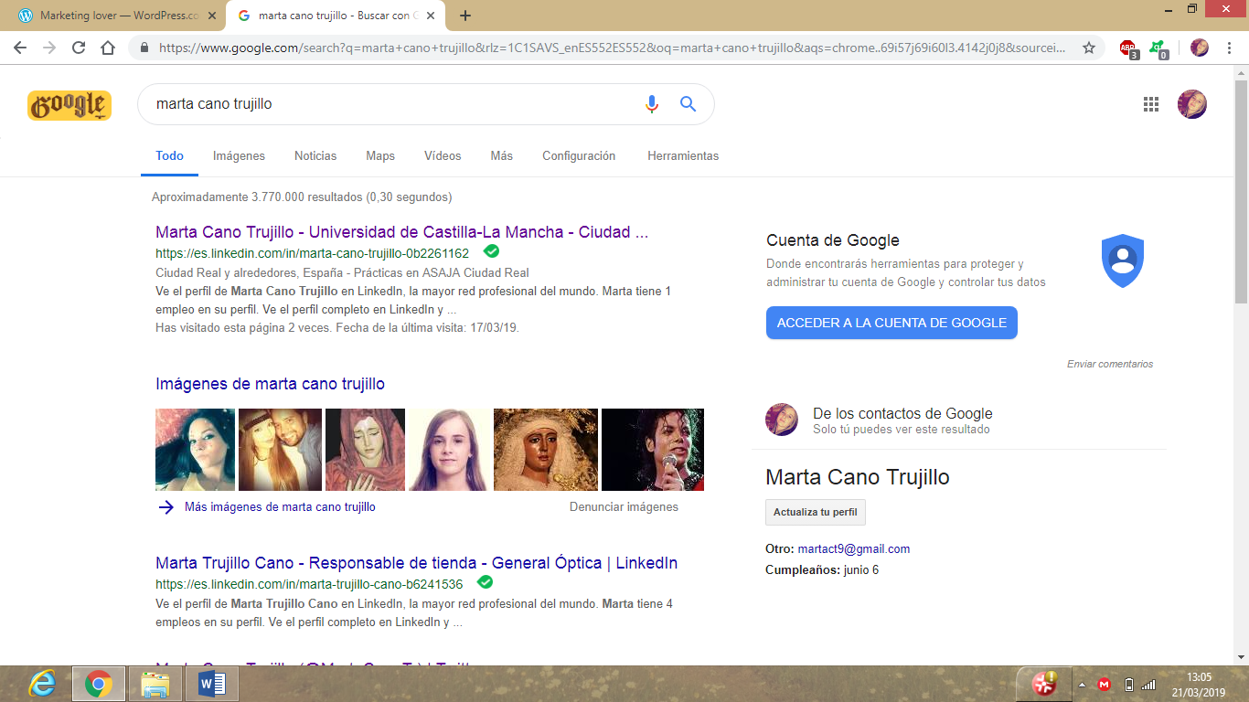 Por ejemplo, en mi caso, lo primero que sale es mi Llinkedin, seguido del Facebook, el cual tengo privatizado, por lo cual no se tiene acceso a mis fotos. Esto quiere decir que las empresas que me busquen sólo van a tener acceso a mi perfil de Llinkedin.